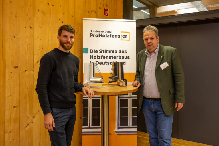 Einen Tag ging’s nur ums Holzfenster: Anfang Oktober hatten der Bundesverband ProHolzfenster und der Fachverband des Tischlerhandwerks NRW ins Zentrum HOLZ in Olsberg eingeladen. Das Hybrid-Seminar versammelte rund 125 Teilnehmende aus ganz Deutschland. Zu erleben waren sieben Fachvorträge, die thematisch einen großen Bogen spannten: Es gab Einblicke in den Status des deutschen Waldes, in die Ausschreibung von Holz- und Holz-Alu-Fenstern und in die Arbeit eines Gutachters. Außerdem auf dem Programm: Eine Einführung in die Historie des Fensterbaus und die denkmalschutzgerechte Aufarbeitung von Fenstern und Fensterglas – und ein Update aus der Forschung zur Kreislaufführung von Holzfenstern. Neben dem fachlichen Input blieb auch Zeit für Austausch und Kontaktpflege. Unser Bild zeigt Kai Pless (Bundesverband ProHolzfenster) und Martin Schwarz (Wald und Holz NRW).